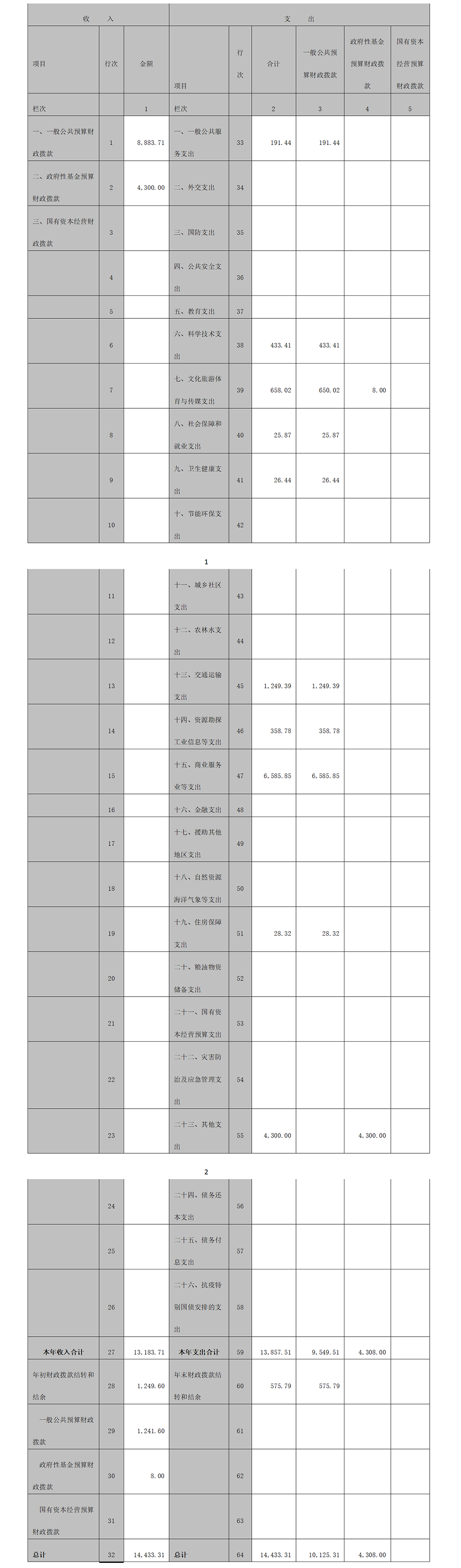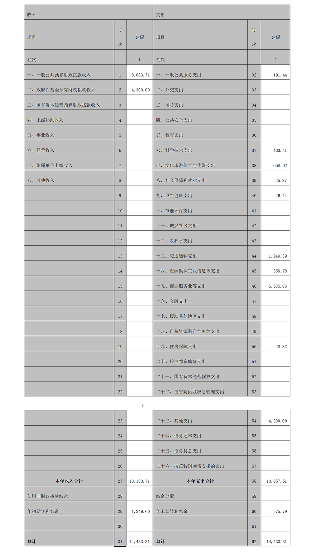 2020年度收、支總計14,433.31萬元。收、支較上年決算數增加1,153.95萬元,增長8.69%,主要原因是1.政府性基金預算財政撥款收入:高家莊多式聯運改擴建工程-貨場工程項目建設資金;2.部分項目實施工期長,未達驗收條件,結轉結余資金增加。
