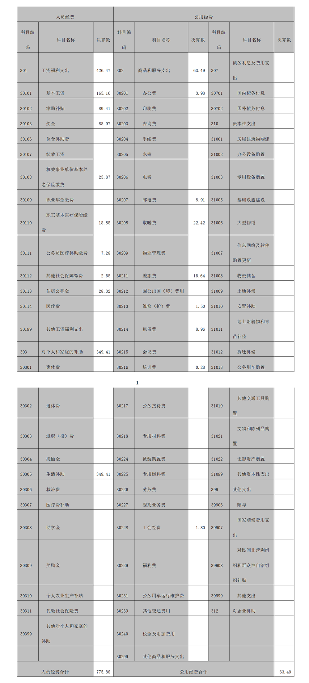 2020年度一般公共預算財政撥款基本支出839.37萬元。其中:人員經費775.88萬元,較上年決算數增加259.14萬元,增長50.15%,主要原因是人員增加,工資基數調整。人員經費用途主要包括基本工資165.16萬元、津貼補貼89.41萬元、獎金88.97萬元、機關事業單位基本養老保險繳費25.87萬元、職工基本醫療保險繳費18.88萬元、公務員醫療補助繳費7.28萬元、其他社會保障繳費2.58萬元、住房公積金28.32萬元、生活補助349.41萬元。公用經費63.49萬元,較上年決算數減少0.01萬元,下降0.02%,主要原因是受疫情影響,減少了培訓和會務支出。公用經費用途主要包括辦公費3.98萬元、郵電費8.91萬元、取暖費22.42萬元、差旅費15.64萬元、維修(護)費1.50萬元、租賃費8.96萬元、培訓費0.28萬元、工會經費1.80萬元。