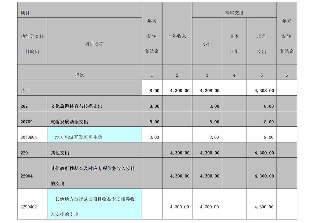 2020年度政府性基金預算財政撥款年初結轉和結余8.00萬元,本年收入4,300.00萬元,本年支出4,308.00萬元,年末結轉和結余0.00,支出具體情況如下:1.支付高家莊多式聯運改擴建工程-貨場工程項目建設資金4,300.00萬元;2. 支付2019年國家旅游基金基本補助項目資金8.00萬元。