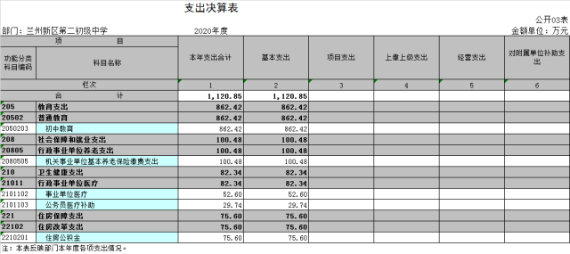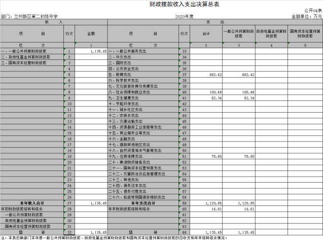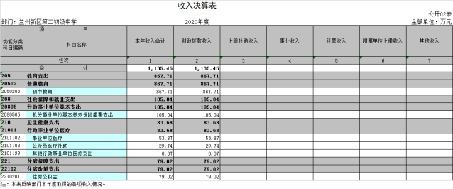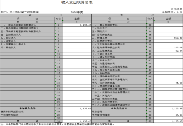 2020年度收、支總計1135.45萬元。收、支較上年決算數增加1135.45萬元,增長100%,主要原因是蘭州新區第二初級中學自2017年8月至2019年12月,所有經濟活動由蘭州新區西岔學區代管。根據上級文件精神自2020年1月起才作為獨立預算決算單位,學校人員和學生人數由蘭州新區西岔學區根據實際劃撥,各項經費收支由我校獨立完成。