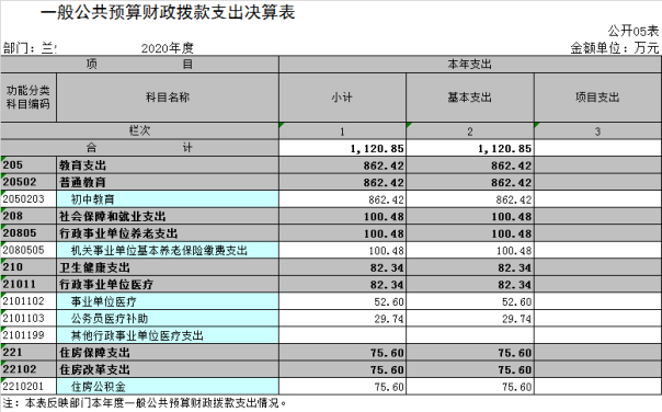 我校2020年決算總支出為1120.85萬元,其中人員經費支出1057.92萬元,占總支出比例94.4%;公用經費支出62.93萬元。占總支出比例5.6%.