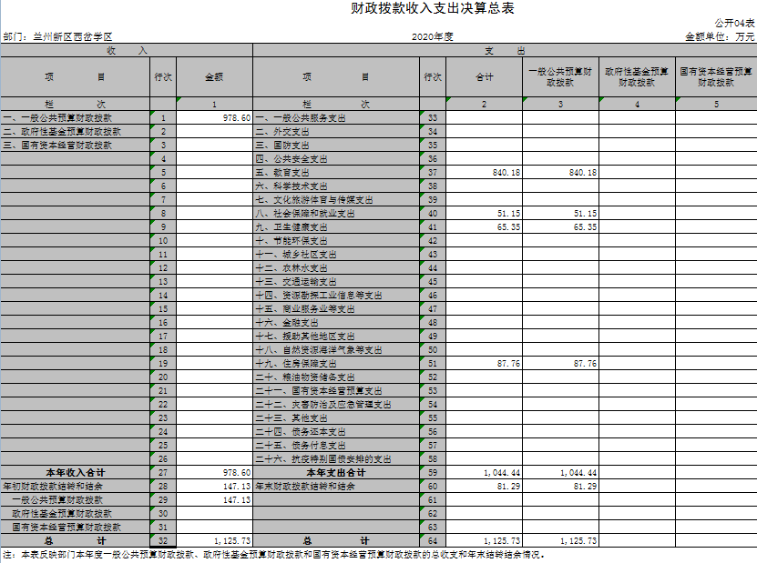 2020年度收、支總計(jì)1,125.73萬元。收、支較上年決算數(shù)減少2,332.16萬元,下降67.44%,主要原因是西岔學(xué)區(qū)原來代管的新區(qū)二中,新區(qū)二小財(cái)務(wù)全部獨(dú)立,中川小學(xué)撤并,造成200名教師轉(zhuǎn)出,2000多名學(xué)生轉(zhuǎn)出,從而經(jīng)費(fèi)相比上年度大幅度下降。
