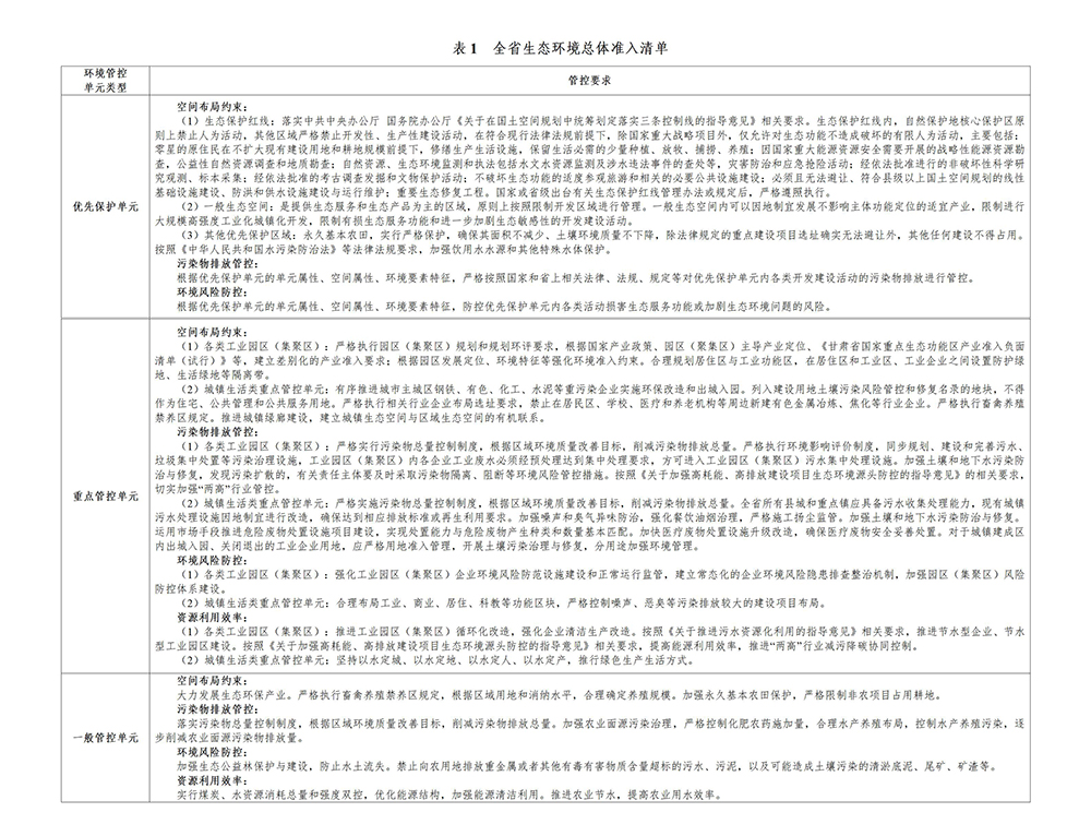 2.實際使用中應根據各管控單元所涉及的區域,自上而下依次查閱甘肅省生態環境總體準入清單、所在區域(流域)生態環境準入清單、蘭州新區生態環境總體準入要求以及環境管控單元準入清單,分層級明確各環境管控單元應執行的管控要求。