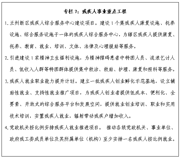 強化殘疾預防。保障殘疾人基本康復服務需求,加強輔助器具推廣和適配服務,鞏固國家康復輔助器具產業綜合創新試點和康復輔助器具社區租賃服務試點成果,推廣試點經驗。完善殘疾人權益保障機制,加快無障礙環境建設。全面推進公共場所、交通出行、社區居家、信息網絡等無障礙環境建設,將蘭州新區建設成西部地區無障礙建設示范城市。健全殘疾預防工作體系,完善殘疾預防政策與措施。扎實開展殘疾預防知識普及教育,減少藥物致殘,控制、減少環境因素和意外事故致殘。健全精神殘疾預防、工傷致殘預防、職業病防治監管體系。認真組織“全國助殘日”、“國際殘疾人日”等活動,大力宣傳自強模范、扶殘助殘先進集體和個人等典型事跡。