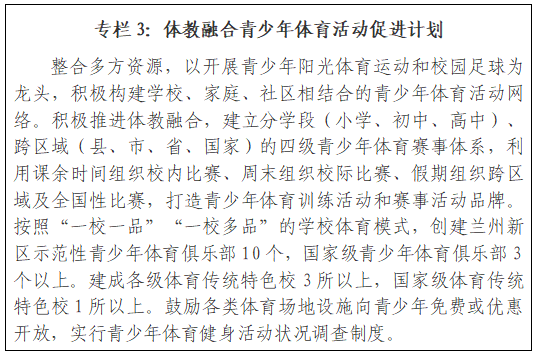 ——體教融合,強化育人。發揮蘭州新區機構設置優勢,全面開創體教融合新局面,推動青少年文化學習和體育鍛煉協調發展,促進青少年健康成長、錘煉意志和健全人格,培養德智體美勞全面發展的社會主義建設者和接班人。