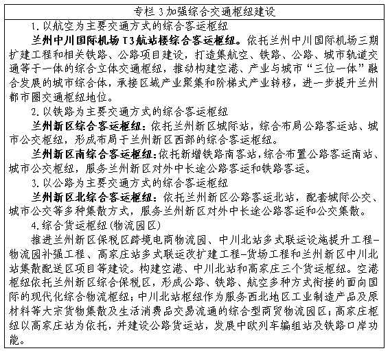 西北區域性綜合交通樞紐:搶抓新時代推進西部大開發、黃河流域生態保護和高質量發展等重大戰略機遇,統籌推進鐵路、公路、航空、軌道交通建設,鞏固提升陸路交通優勢,打造與蘭州主城區、白銀市等地“半小時交通圈”,增強區域中轉集散能力,擴大對周邊區域的輻射范圍,打造西北區域性核心樞紐節點。加快實施中川機場三期擴建工程,強化機場與軌道交通、高速公路等交通運輸方式的有效銜接,建設內暢外聯、互聯互通、立體多元、綠色智能的現代綜合交通體系。