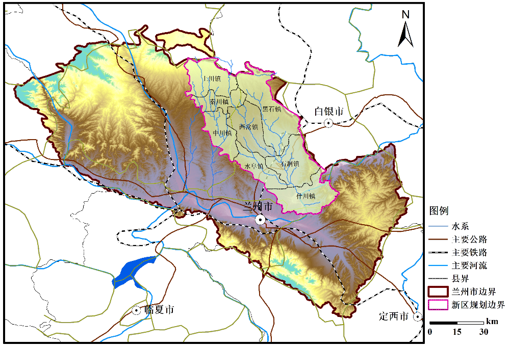 按照蘭州新區管理委員會關于“十四五”規劃編制工作統一安排部署,蘭州新區水務部門委托蘭州大學編制了《蘭州新區“十四五”水利發展規劃》,本次規劃范圍包括原國務院批復涉及的5個鎮(秦川、中川、西岔、上川、水阜),以及與“區縣合一”密切相關的皋蘭縣黑石鎮、石洞鎮、什川鎮3鎮。規劃總面積2845km2,規劃基準年為2020年,規劃期為2021~2025年。