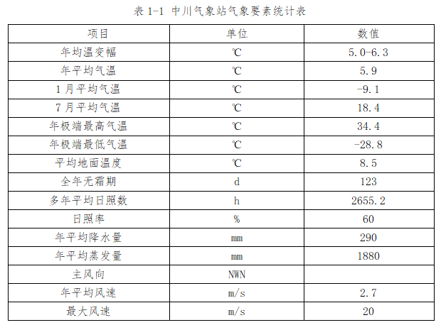 據中川氣象站統計資料發現:蘭州新區多年平均氣溫6.5℃,年平均降水量290mm,降雨主要集中分布在7-9月,年均蒸發量1880mm,年日照數2600h,無霜期約在150天左右,最大凍土深度1.46m,主導風向為西北風,年平均風速2.3m/s(見表1-1)。總特征是氣候干燥,降水少,日照多,溫差大,光能潛力大,四季分明,冬季寒冷干燥,春季多風少雨,夏無酷暑,秋季溫涼。