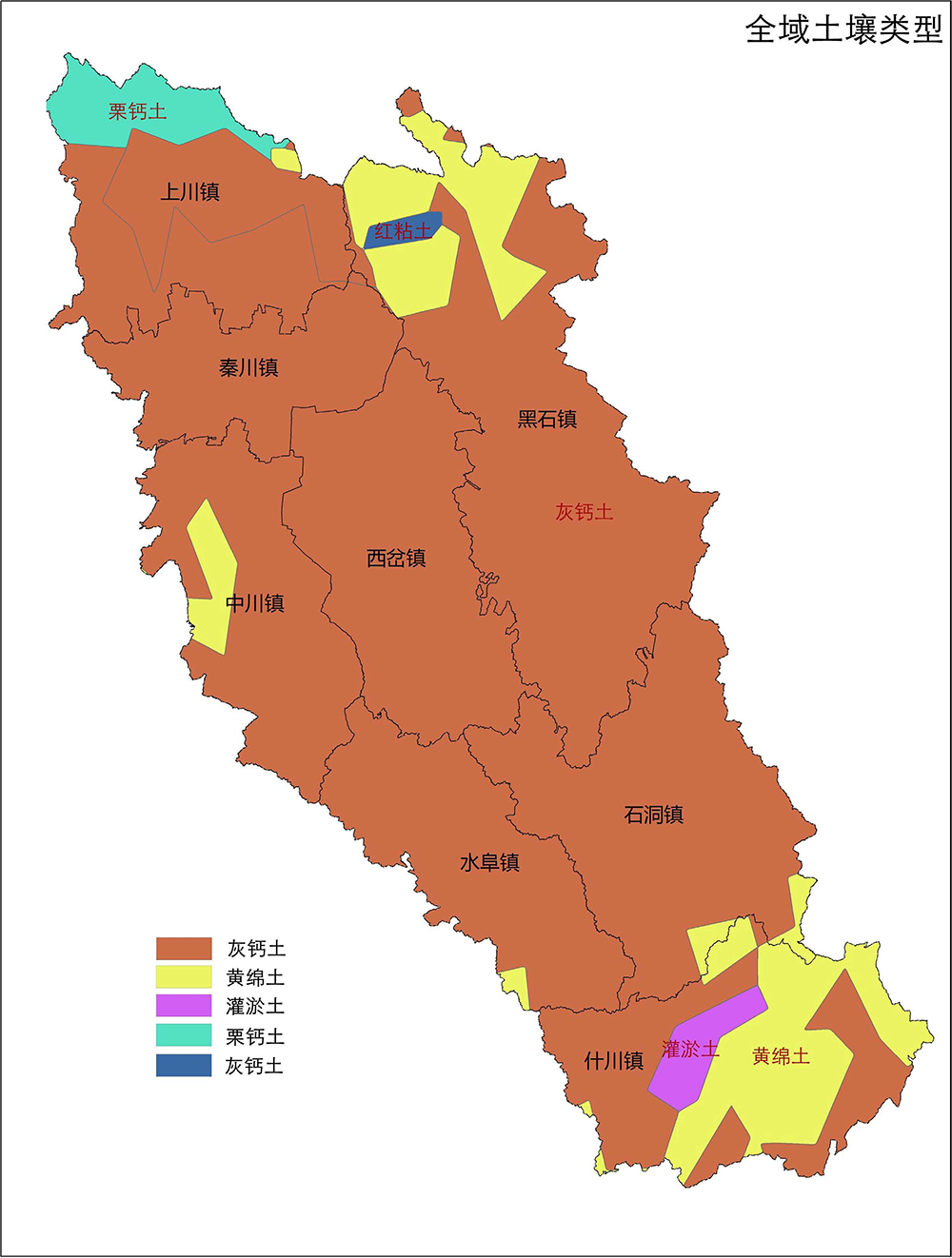 秦王川盆地成土以黃土母質為主,受人類活動影響,區域內主要包括灰鈣土、淡灰鈣土、鹽化灰鈣土、黃綿土和紅粘土等亞類。灰鈣土和淡化灰鈣土均為地帶性土壤,是發育在深厚黃土母質上暖溫帶荒漠草原區的弱淋溶干旱土,土壤有機質含量1~2.5%;本區蒸發量是降水量的6~7倍,為鹽分向上遷移并聚集地表創造了條件,在北部發育成鹽化灰鈣土亞類;在新區南部分布有小面積的黃綿土和紅粘土,土壤肥力水平較低。北部土壤質地較輕,南部粘重,多為粉質粘土及粘土(見圖1-4)。