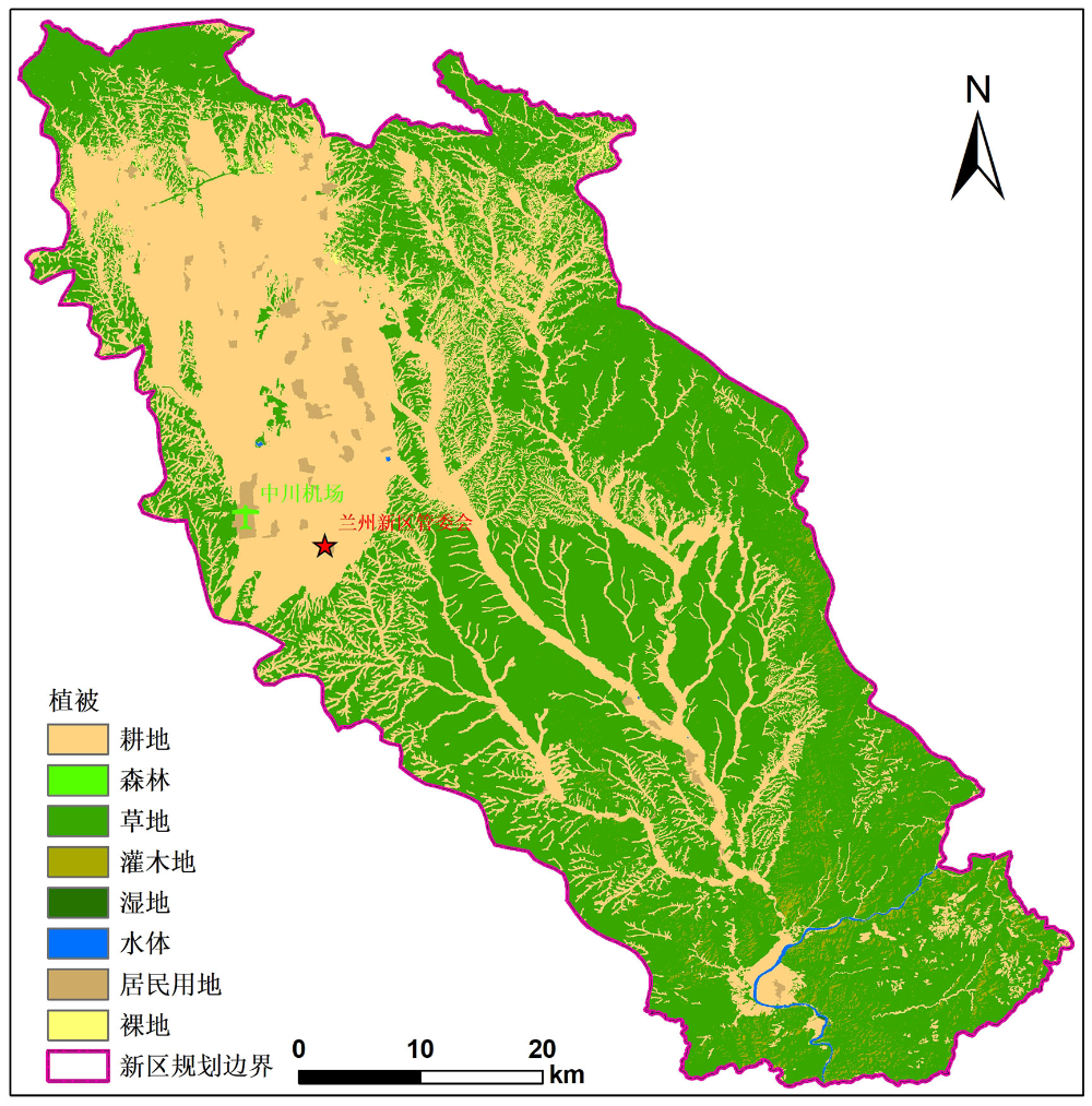 蘭州新區因地處西部干旱地區,生物總量和生物多樣性較低,原生植被覆蓋率較低,整體生態環境較為脆弱,城市建設土地資源利用變化對當地生態環境造成了直接影響。在北部地區人工建設防護林和經濟林為林業主要模式,種植樹種主要包括楊樹、柳樹、側柏等高大喬木;灌木種類以檸條、野生枸杞等為主。蘭州新區森林植被主要以人工栽植的生態防護林和農業經濟林為主。新區內部森林景觀主要分布在機場高速兩側及耕地內部農田防護林林網。