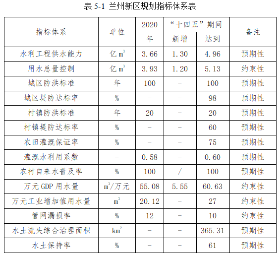 “十四五”規劃實施后,蘭州新區水利工程供水能力將達到4.41億m3,城區防洪標準將達到100年一遇,村鎮防洪標準將達到20年一遇,農田灌溉保證率將達到75%以上,灌溉水利用系數將達到0.60以上,農村自來水普及率將實現100%全覆蓋,萬元工業增加值用水量將達到27m3,萬元GDP用水將達到60.63m3,管網漏損率將控制在10%以內,完成水土流失綜合治理面積365.31km2,再生水利用率將達到35%。