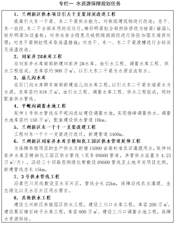 水資源保障工程39.04億元。主要包括蘭州新區供水項目引大封閉改造工程、蘭州新區劉家井2#水庫工程、蘭州新區廟兒溝水庫工程、蘭州新區養殖園區供水工程、蘭州新區東一干十一支渠改建工程、火家灣調蓄水池輸水管線工程、平峴溝調蓄水池工程、石峽子水庫、西山水庫、三川口水庫建設工程。