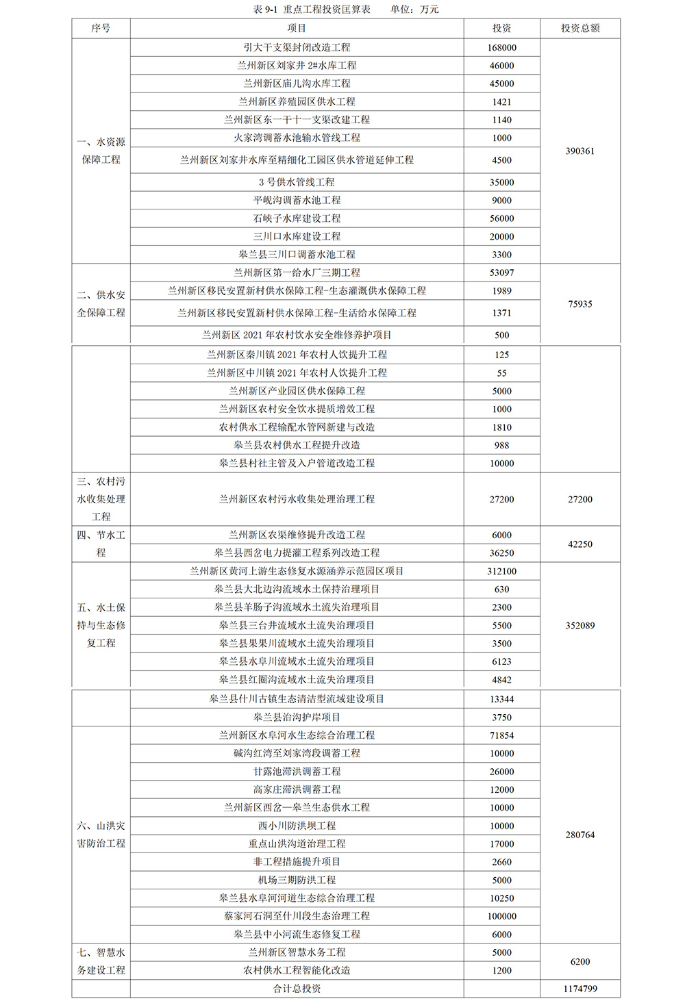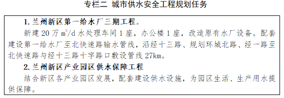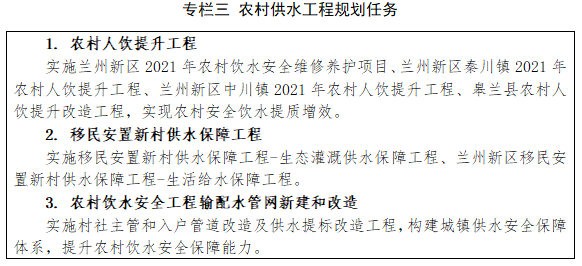供水安全保障工程投資7.59億元。主要包括蘭州新區第一給水廠三期工程、蘭州新區移民安置新村供水保障工程、蘭州新區2021年農村飲水安全維修養護項目等。