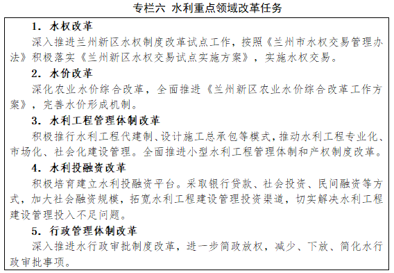 深入推進水權制度改革。結合蘭州新區經濟社會發展用水需求,深入推進蘭州新區水權制度改革試點工作,建立科學的水權制度體系,充分發揮市場機制在水資源配置、水需求調節、強化用水公平和效率等方面的作用。按照《蘭州市水權交易管理辦法》,積極落實《蘭州新區水權交易試點實施方案》,實施水權交易。