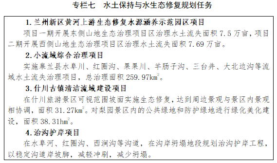 水土保持與水生態修復工程投資35.21億元。主要包括蘭州新區黃河上游生態修復水源涵養示范園區項目、皋蘭縣大北邊溝流域綜合治理項目、羊腸子溝流域綜合治理項目、三臺井流域綜合治理項目、果果川流域綜合治理項目、治溝護岸項目、什川古鎮生態清潔型流域建設項目。