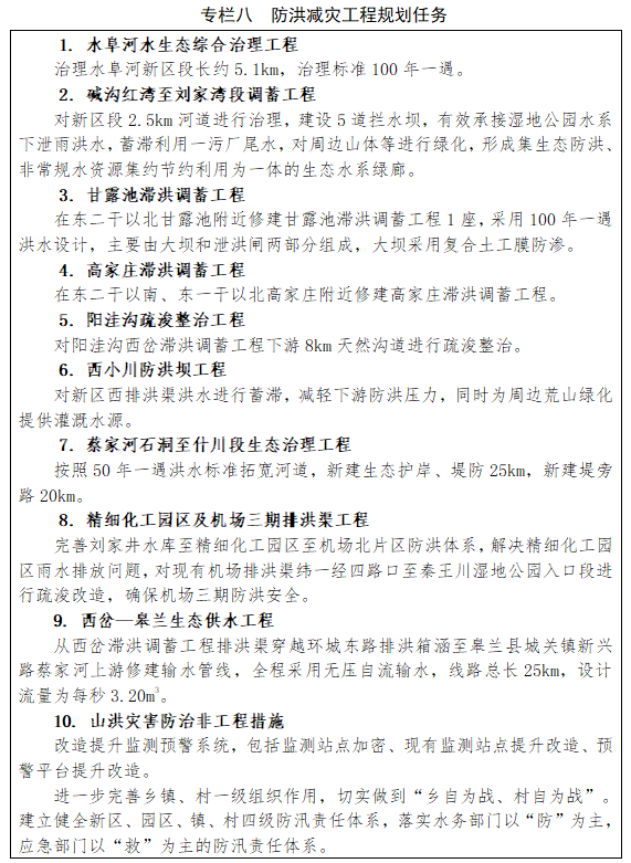 防洪減災能力提升工程投資28.07億元。主要包括蘭州新區水阜河水生態治理工程、堿溝紅灣至劉家灣段調蓄工程、甘露池滯洪調蓄工程、高家莊滯洪調蓄工程、機場三期排洪渠改遷工程、皋蘭縣水阜河防洪治理工程、蔡家河石洞至什川段生態治理工程、皋蘭縣中小流域生態修復及防洪治理等工程。