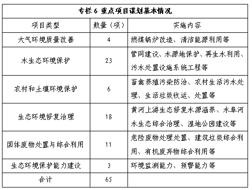 圍繞大氣環境質量改善、水生態環境保護、農村和土壤環境保護、生態環境修復治理、固體廢物處置與綜合利用、生態環境保護能力建設6個重點領域,初步謀劃重點項目65項。