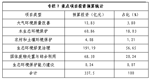 重點項目預算總投資約337.5億元,其中生態環境修復治理項目投資最大,占預算總投資的56.65%;水生態環境保護項目、固體廢物處置與綜合利用項目投資量大體相當,分別占18.03%和20.24%;大氣環境質量改善項目、農村和土壤環境保護項目、生態環境保護能力建設項目投資較小,分別占3.8%、1.21%和0.07%。