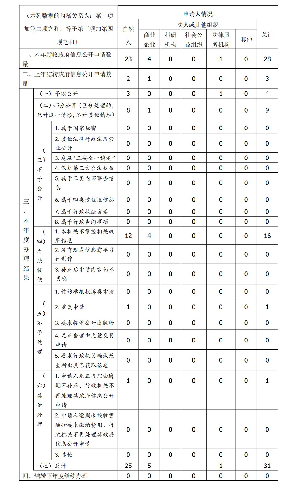 (四)規范辦理依申請公開事項。暢通受理渠道,規范答復意見,進一步規范依申請公開事項的受理、辦理和回復程序,提升依申請公開辦理質量。對收到的政府信息公開申請實行臺賬式管理,確保按照法定時限和程序做出答復。2021年度共處理政府信息公開申請31件,其中上年結轉3件,本年新收28件。處理結果為予以公開4件,部分公開9件,本機關不掌握相關信息16件,重復申請1件,申請人無正當理由逾期不補正、行政機關不再處理其政府信息公開申請1件。行政復議結果糾正后處理2件,行政訴訟結果糾正后處理1件。
