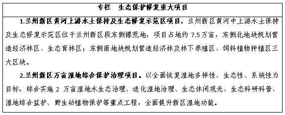 黃河上游生態保護示范區。全面落實黃河流域生態保護和高質量發展戰略,堅持生態優先、綠色發展,以生態保護為核心,統籌推進山水林田湖草綜合治理、系統治理、源頭治理,加強生態修復、水土保持和污染防治,建設黃河上游未利用土地綜合開發示范區和蘭州—新區—白銀黃河中上游水土保持及生態修復示范區,為黃河上游地區生態保護和綠色發展崛起打造新區樣板、作出新區示范。