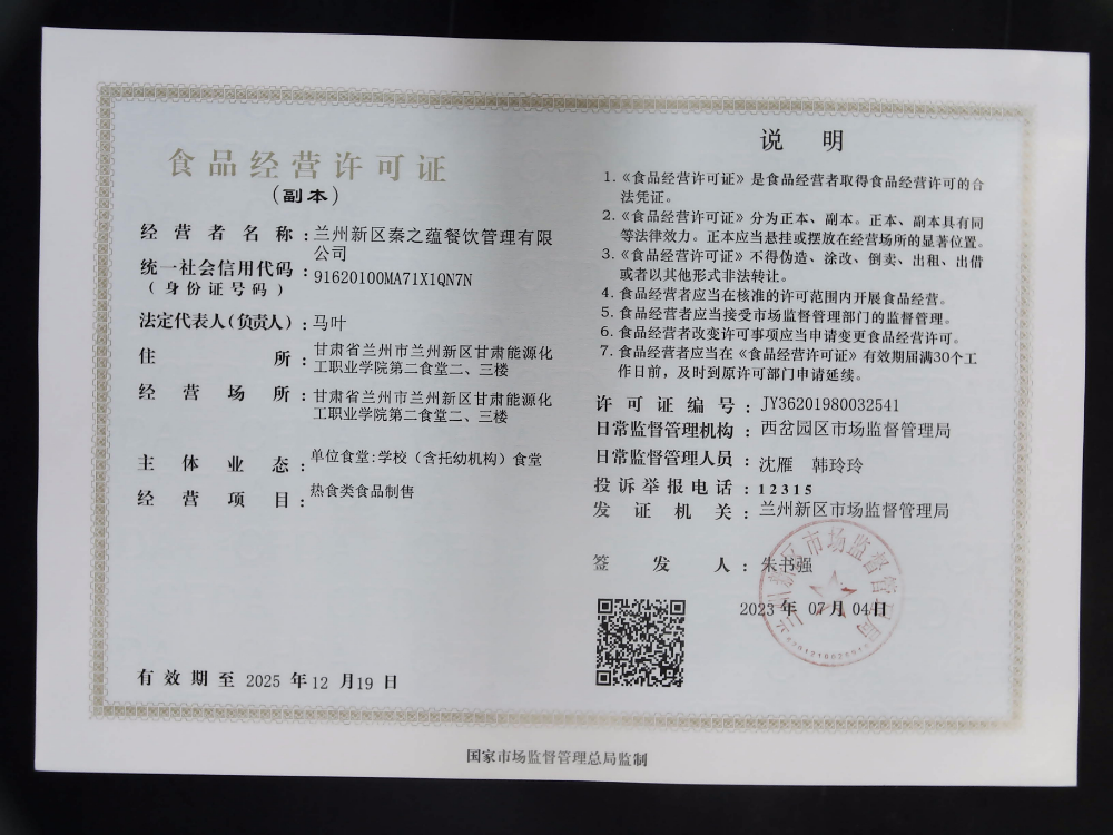 蘭州新區秦之蘊餐飲管理有限公司食品經營許可證