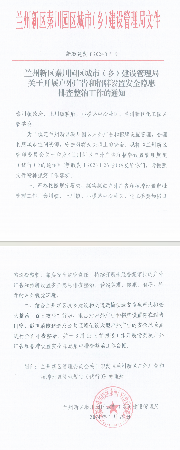 蘭州新區秦川園區城市(鄉)建設管理局關于開展戶外廣告和招牌設置安全隱患排查整治工作的通知