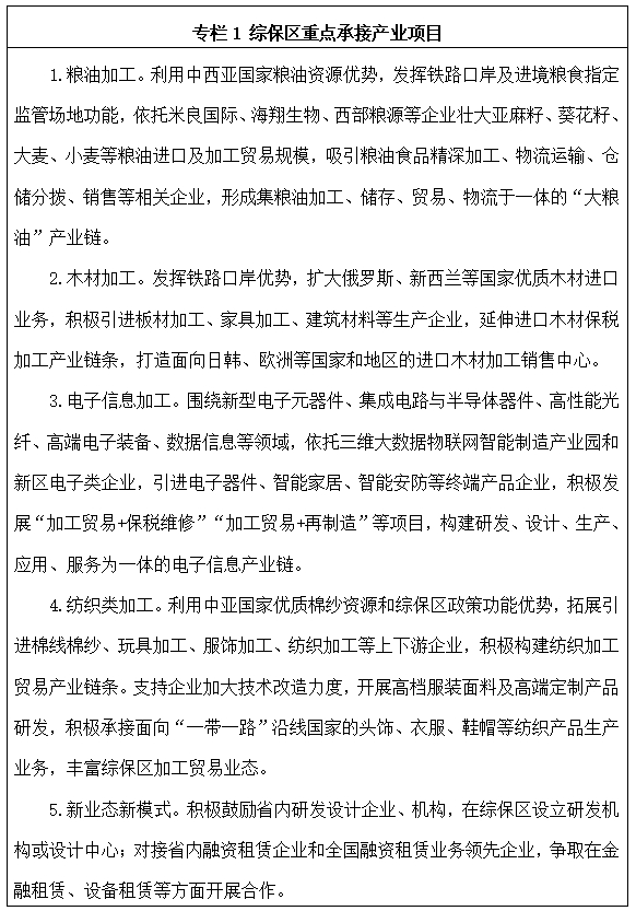 現代農業產業方面。利用進口班列、進境糧食指定監管場地平臺優勢,結合綜保區政策功能優勢和蘭州新區已落地糧油加工及儲備分撥、農畜產品加工、農藥疫苗、生態養殖、特色種植、冷鏈物流等項目基礎,積極承接食品精深加工、高端保健食品加工、農產品研發培育等相關項目轉移落地,有序擴大糧油產品進口倉儲分撥、先進農業機械、種植灌溉設備和技術進口、農業技術研發等業務,促進以糧油產品為代表的現代農業產業加工貿易轉型升級。