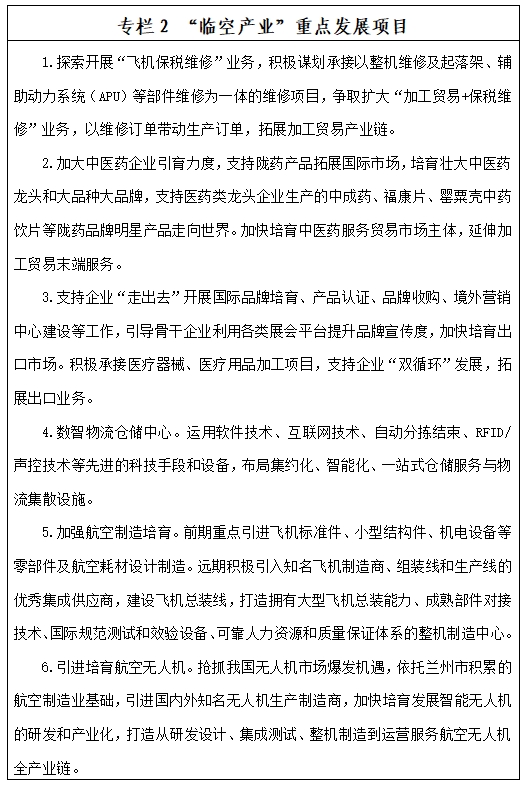 充分發揮蘭州中川國際機場區域性航空物流樞紐優勢,積極融入“空中絲綢之路”建設,結合機場三期建設和現有產業基礎,積極打造面向“一帶一路”沿線的國際航空樞紐,培育引進相關臨空產業項目。