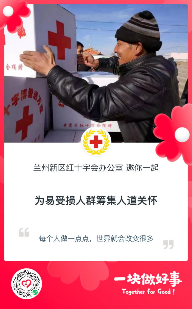 紅十字不僅是一種精神,更是一面旗幟。值此第77個“世界紅十字日”、第3個“5·8人道公益日”來臨之際,蘭州新區紅十字會辦公室發起“5·8人道公益日”一起捐活動。誠邀您關注“甘肅省溫暖家庭箱”項目,為幫助改善新區特殊困難群體生活境況聚微光、匯大愛。