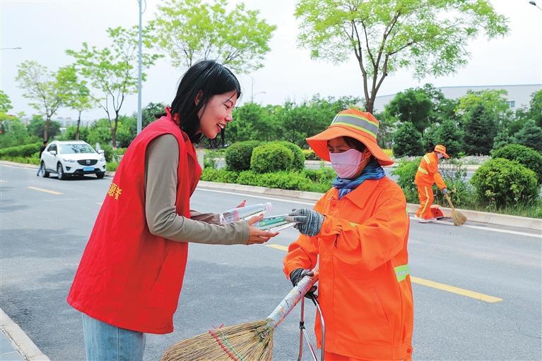 水務(wù)集團禹廣通公司志愿者為環(huán)衛(wèi)工人送水。