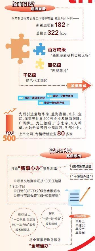 全員抓招商、全力拼經濟。近年來,新區以頂層設計為統攬,以高位推動為基礎,不斷完善機制、優化模式,推動形成上下齊心、齊抓共管的工作格局,百萬噸級“新能源新材料負極之谷”、千億級綠色化工園區、百億級“西部藥谷”正加速形成,招商引資、土地供應等方面出臺了系列政策措施,盤活更多“沉睡資產”。今年新區招商引資工作穩中有進、進中提質,截至6月14日,新區新引進招商引資項目182個、總投資322億元,。