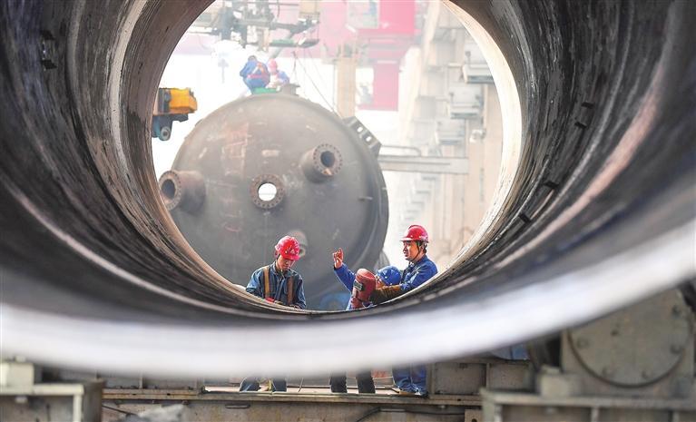 蘭石重裝車間內,工人們進行焊接作業。