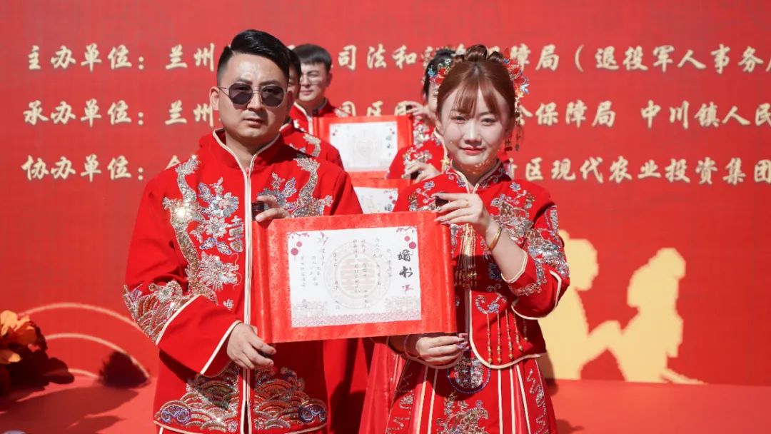 早上8時(shí)許,20對(duì)新人前往新區(qū)史喇口鄉(xiāng)村旅游區(qū)參加由新區(qū)民政司法和社會(huì)保障局(退役軍人事務(wù)局)、中川園區(qū)管委會(huì)主辦,中川園區(qū)民政和社會(huì)保障局、中川鎮(zhèn)人民政府、新區(qū)婚姻登記處承辦的集體婚禮和頒證儀式。在充滿喜慶溫情氛圍的青云驛露營草坪婚禮現(xiàn)場(chǎng),頒證嘉賓和金婚夫婦代表為18對(duì)新人頒發(fā)結(jié)婚證書并贈(zèng)送鮮花,新婚夫婦集體誦讀《蘭州新區(qū)婚俗改革倡議書》后,還舉行了中式婚禮儀式。