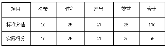 項目績效評價綜合得分為95分,評價結果等級為優。其中過程得10分,產出得50分,效益得27分,滿意度得8分。一級指標得分情況如下表: