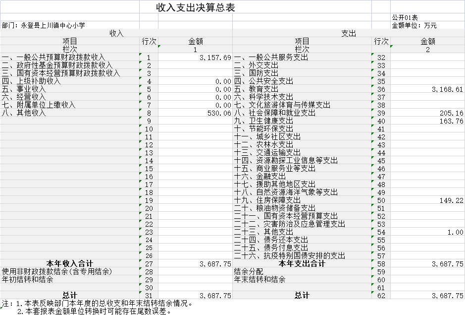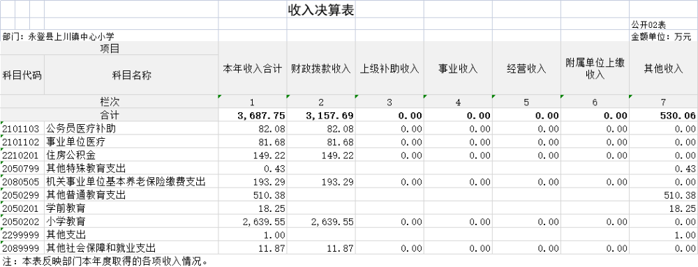 2023年度收、支總計(jì)均為3687.75萬元。與上年度相比,收、支總計(jì)各增加972.24萬元,增長35.8%。主要原因是部分特崗教師轉(zhuǎn)正工資增加,社保、公積金增加,另外工程項(xiàng)目資金增加。