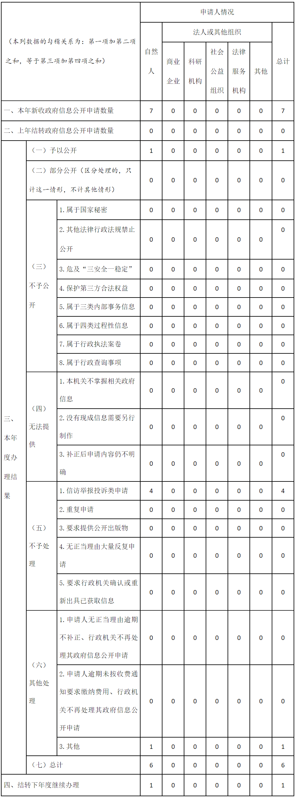 期保質(zhì)完成各項(xiàng)政府信息依申請(qǐng)公開工作。共收到信息公開申請(qǐng)7件,6件依法依規(guī)按期辦結(jié)、1件結(jié)轉(zhuǎn)下年度繼續(xù)辦理。