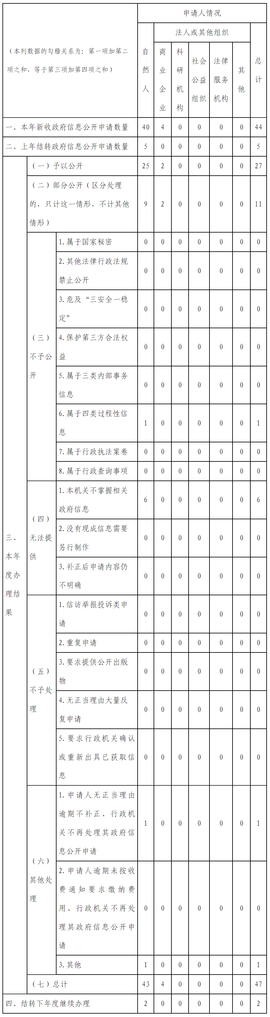 根據《中華人民共和國政府信息公開條例》《甘肅省政務公開工作實施方案》和《蘭州新區2024年政務公開工作要點》要求,我局編制了2024年度政府信息公開年度報告,本報告包括總體情況、主動公開政府信息情況、收到和處理政府信息公開申請情況、政府信息公開行政復議和行政訴訟情況、存在的主要問題及改進情況、其他需要報告的事項等六個部分,所列數據統計期限自2024年1月1日起至2024年12月31日止。