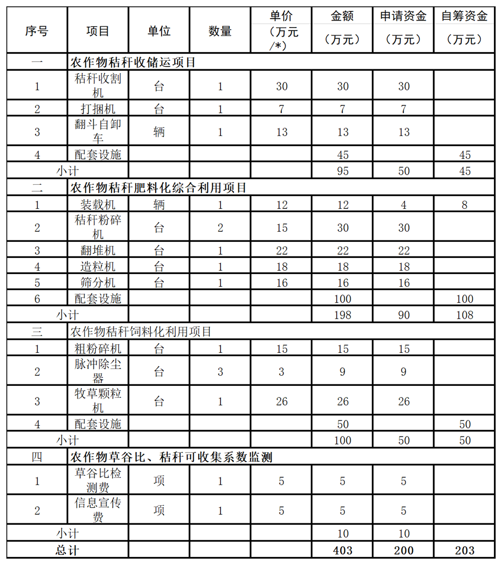 蘭州新區秦川園區2024年農作物秸稈綜合利用試點項目計劃投資403萬元,申請中央財政資金200萬元,企業自籌資金203萬元。其中農作物秸稈收儲運項目投資95萬元,申請2024年中央財政補助資金50萬元,企業自籌資金45萬元;農作物秸稈肥料化綜合利用項目投資198萬元,申請2024年中央財政補助資金90萬元,企業自籌資金108萬元;農作物秸稈飼料化利用項目投資100萬元,申請2024年中央財政補助資金50萬元,企業自籌資金50萬元;農作物草谷比、秸稈可收集系數監測項目投資10萬元,申請2024年中央財政補助資金10萬元。