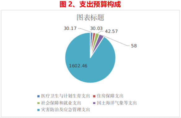 2025年一般公共預算支出1763.22萬元,包括:醫療衛生與計劃生育支出30.17萬元、住房保障支出30.03萬元、社會保障和就業支出42.57萬元、國土海洋氣象等支出58萬元、災害防治及應急管理支出1602.46萬元。