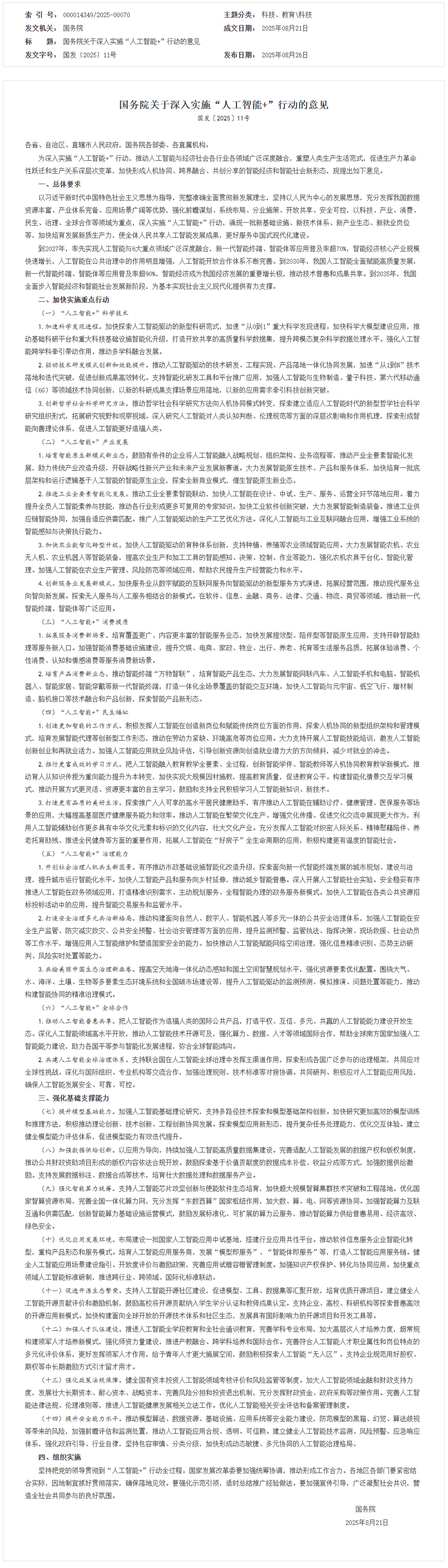 國務院印發(fā)《關(guān)于深入實施“人工智能+”行動的意見》