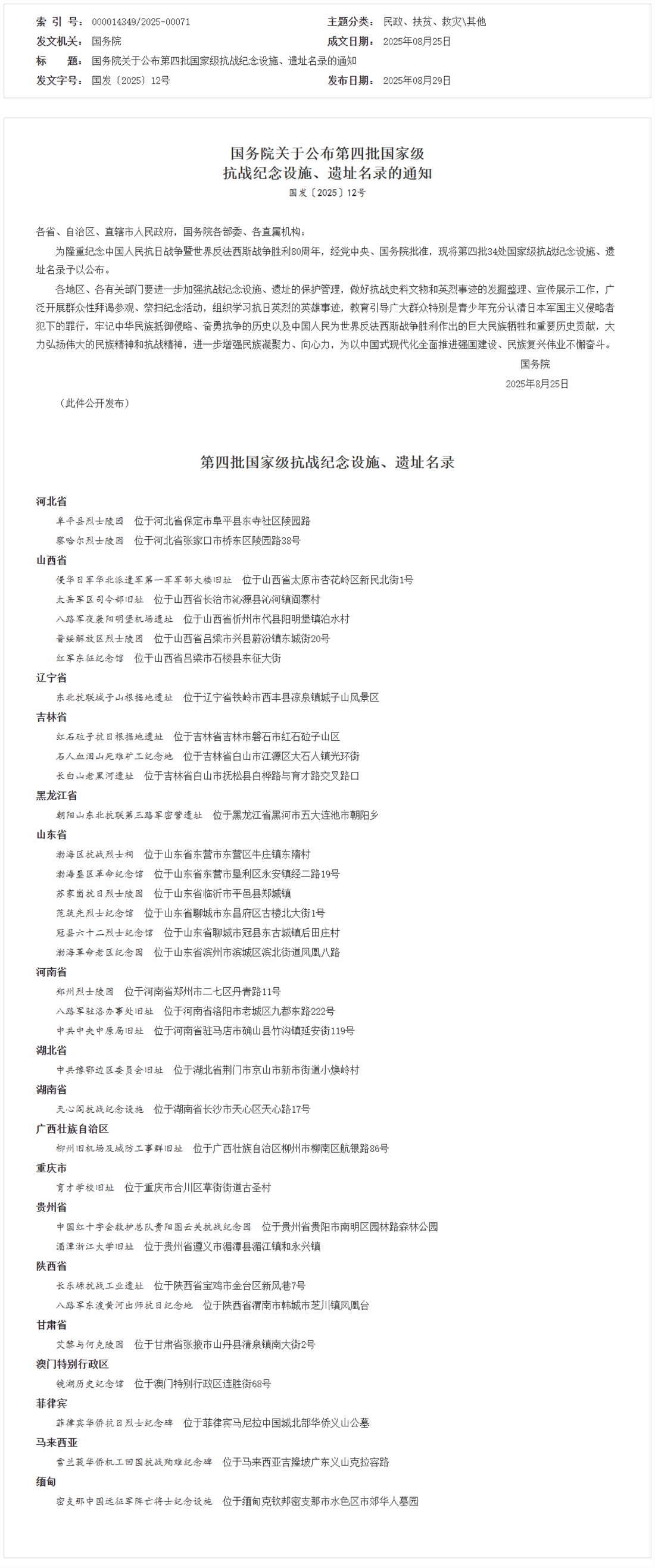 國務院公布第四批國家級抗戰紀念設施、遺址名錄